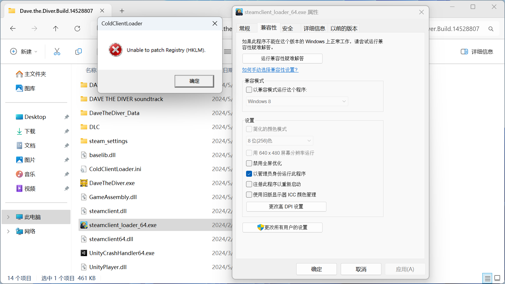 打开时提示无法注册补丁,右键管理员身份运行就可以了。在属性-兼容性里勾选管理员身份运行会方便一点。