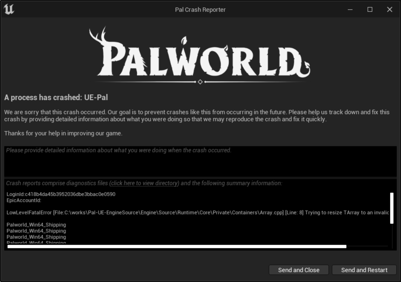 LowLevelFatalError [File:C:\works\Pal-UE-EngineSource\Engine\Source\Runtime\Core\Private\Containers\Array.cpp] [Line: 8] Trying to resize TArray to an invalid size of 3671654400