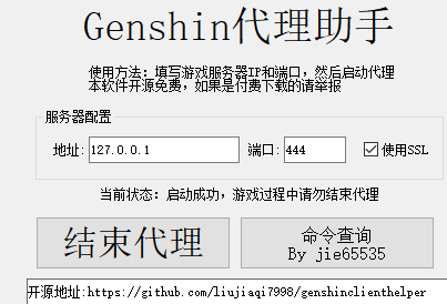 4.启动 代理.exe,地址可不用修改,端口请改为启动服务器时的端口,就是第二步改的端口,如果没改默认为443(前提是你第二步的443默认端口可用。)然后启动代理,启动时,应该会让你安装证书,点确定安装即可。