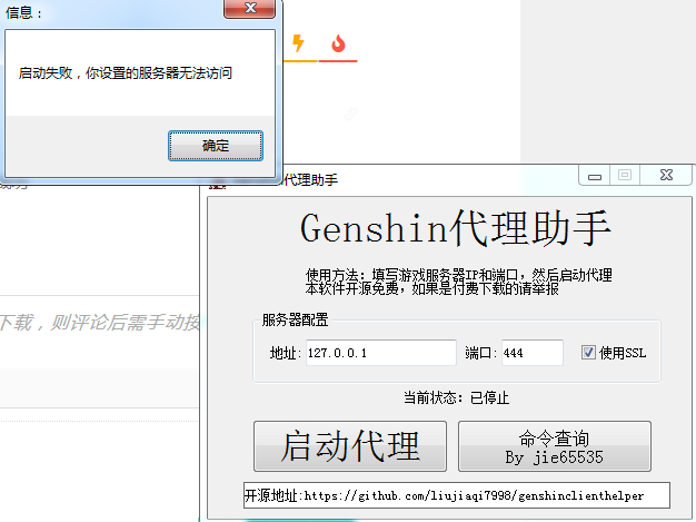 4.启动 代理.exe,地址可不用修改,端口请改为启动服务器时的端口,就是第二步改的端口,如果没改默认为443(前提是你第二步的443默认端口可用。)然后启动代理,启动时,应该会让你安装证书,点确定安装即可。